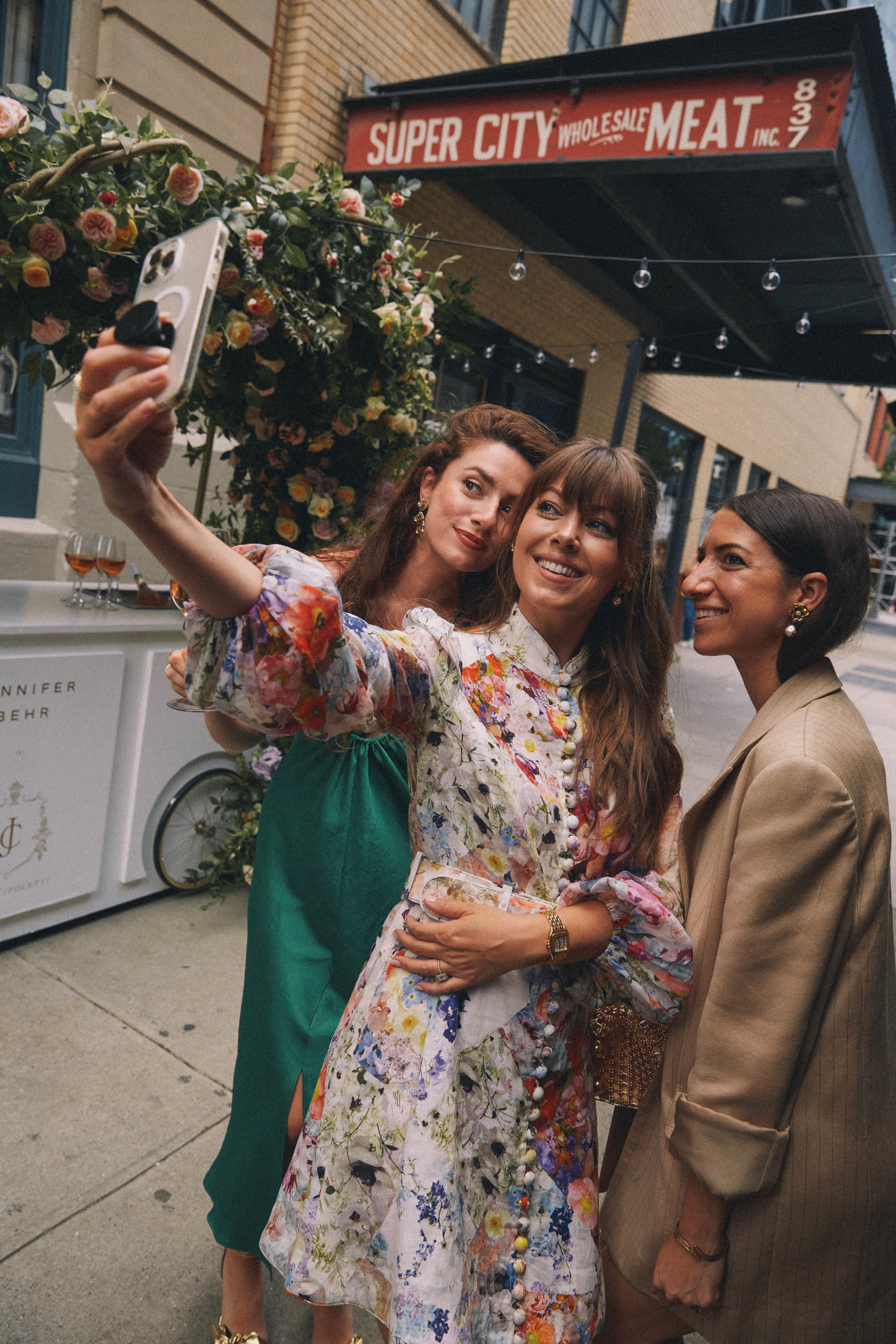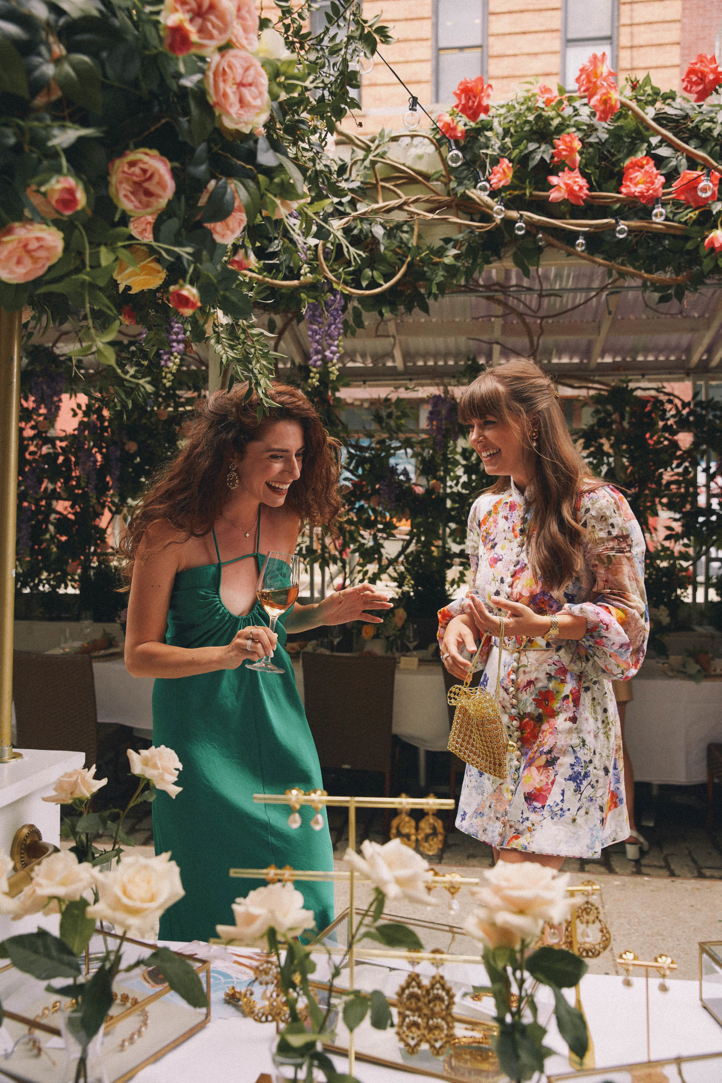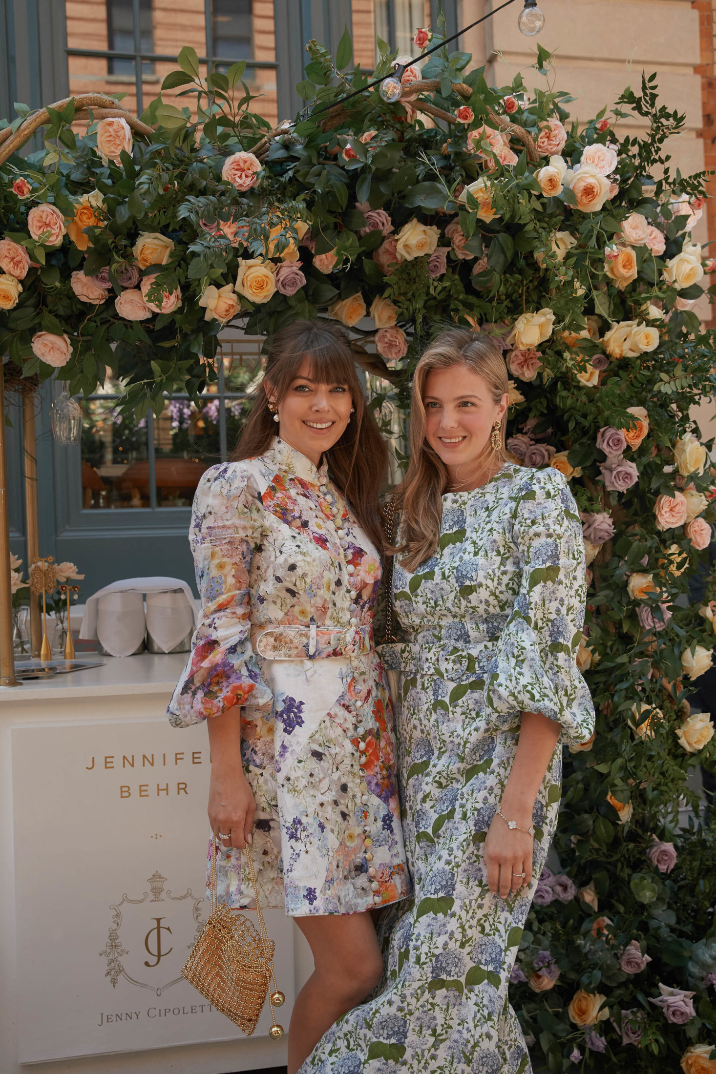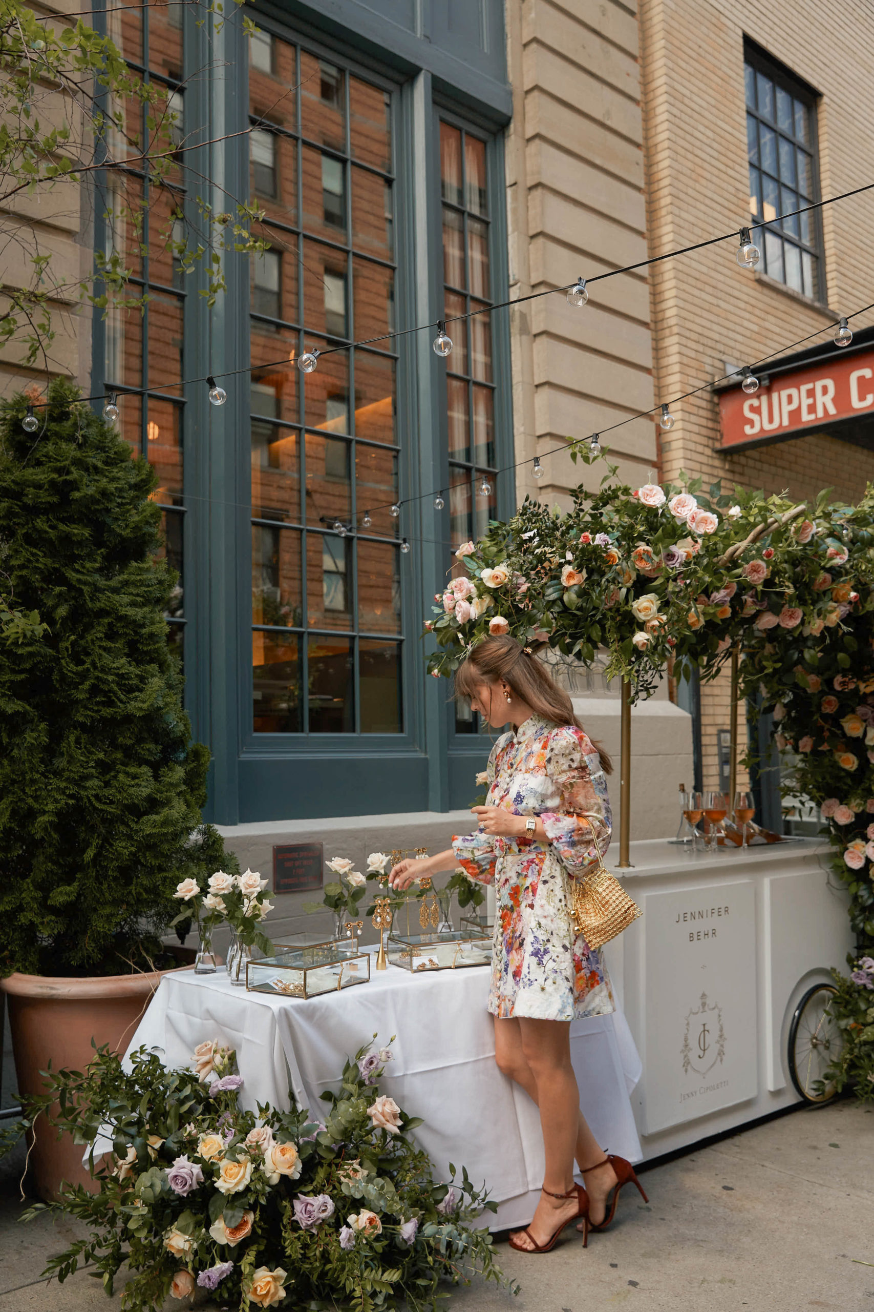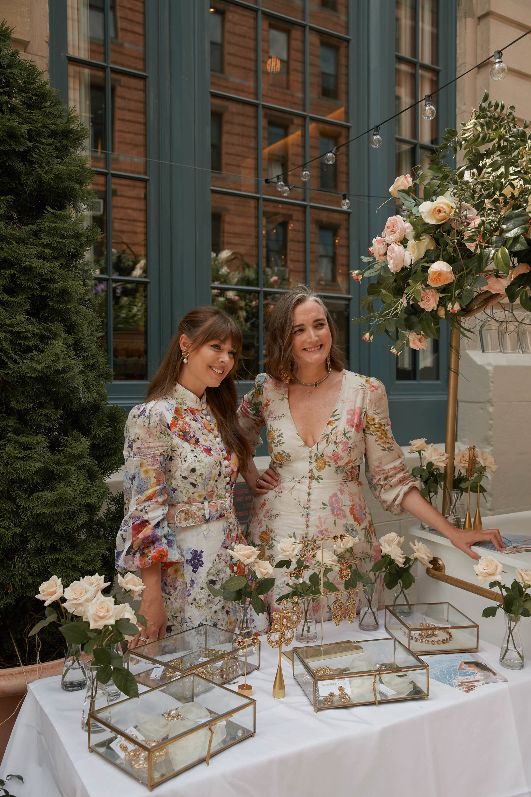We celebrated on launch day with a lunch at Fig & Olive in the Meatpacking district. The accessories and jewelry were displayed next to this elaborate rosé cart – it was a serious pinch me moment to see my logo next to Jennifer’s blown up on the cart! The flower installation was a beautiful tribute to the design inspiration of florals and gardens. A few of my favorite ladies showed up to support wearing pieces from the collection, that was the moment it felt so real! To see my friends wearing the pieces that I designed meant the world to me.
