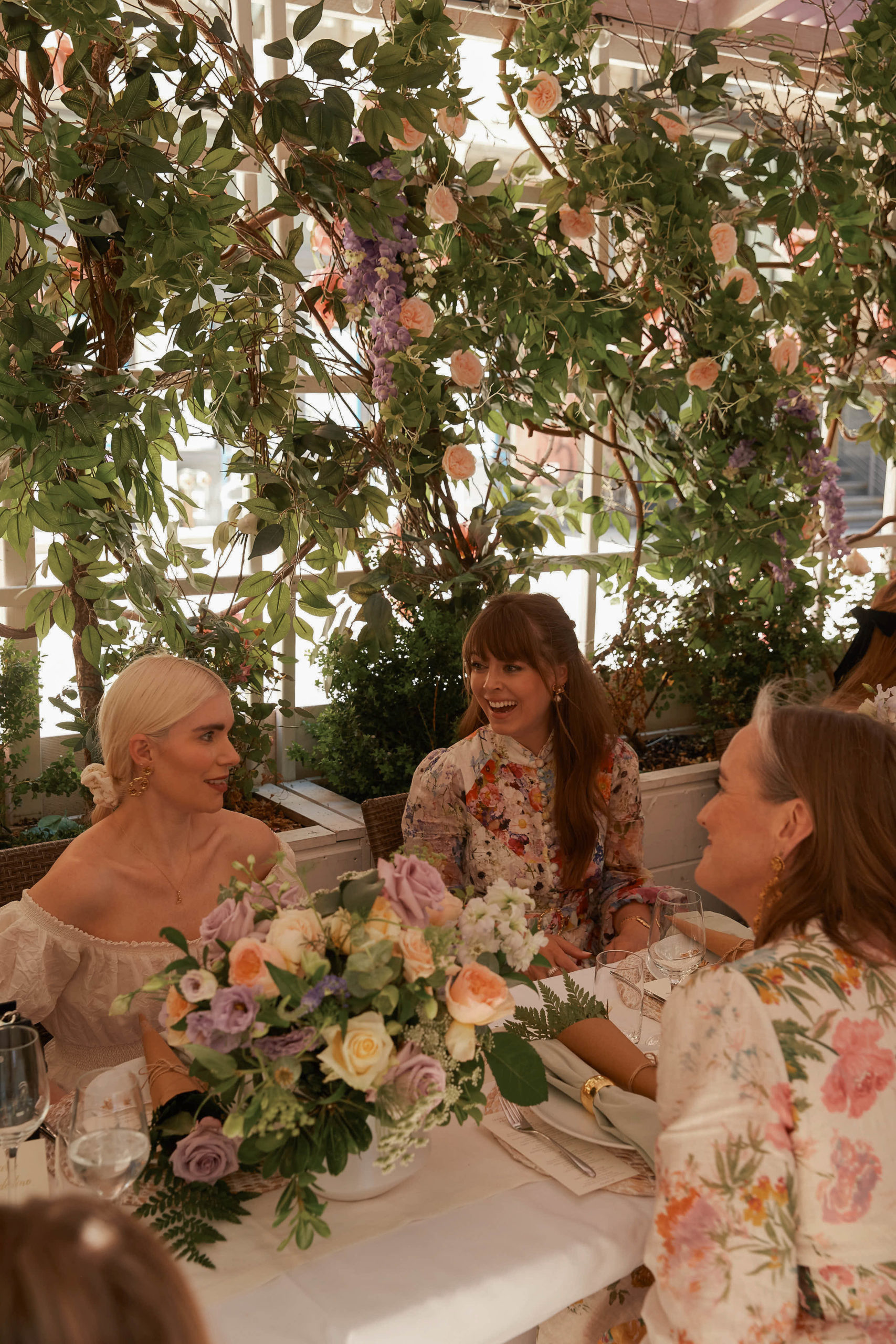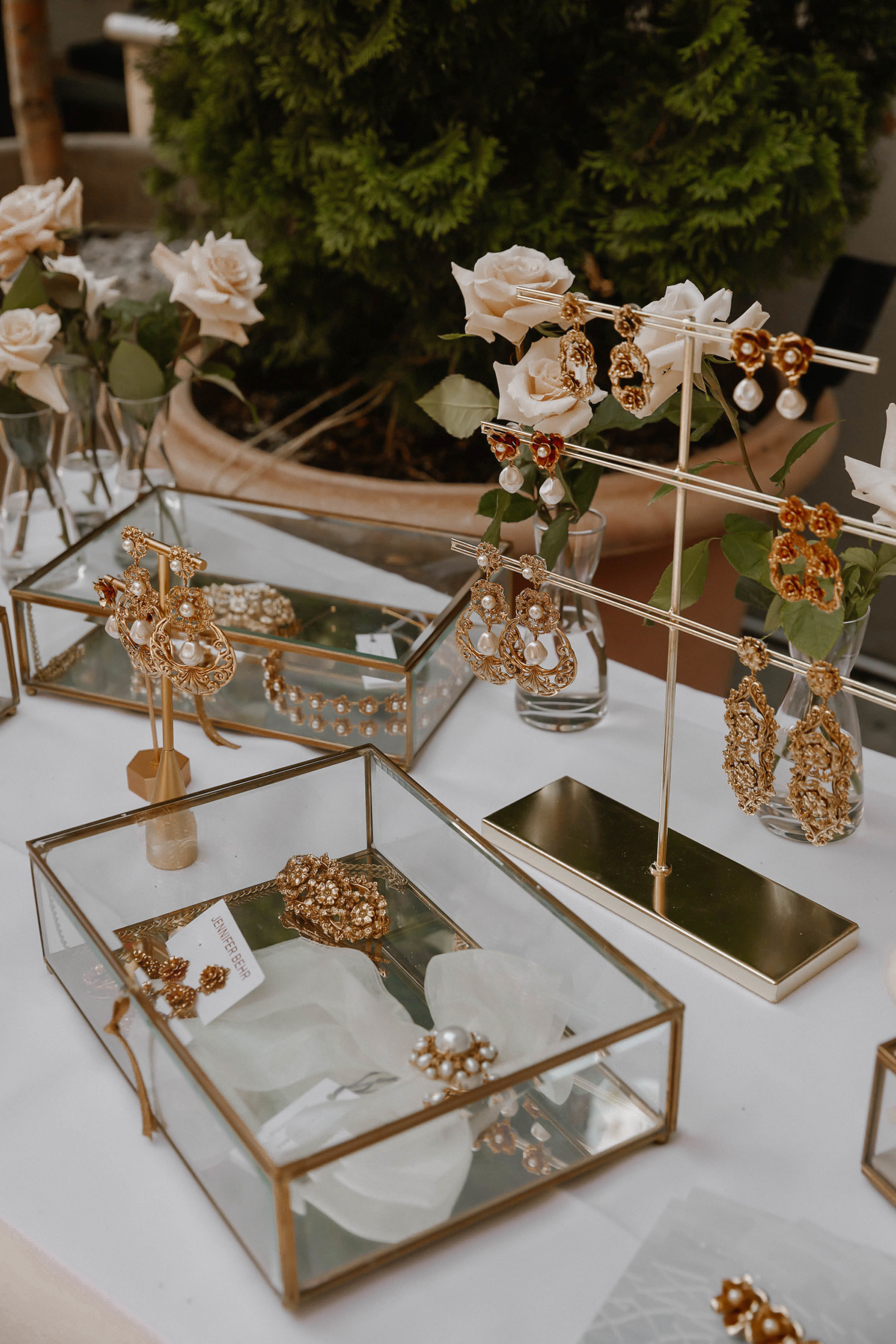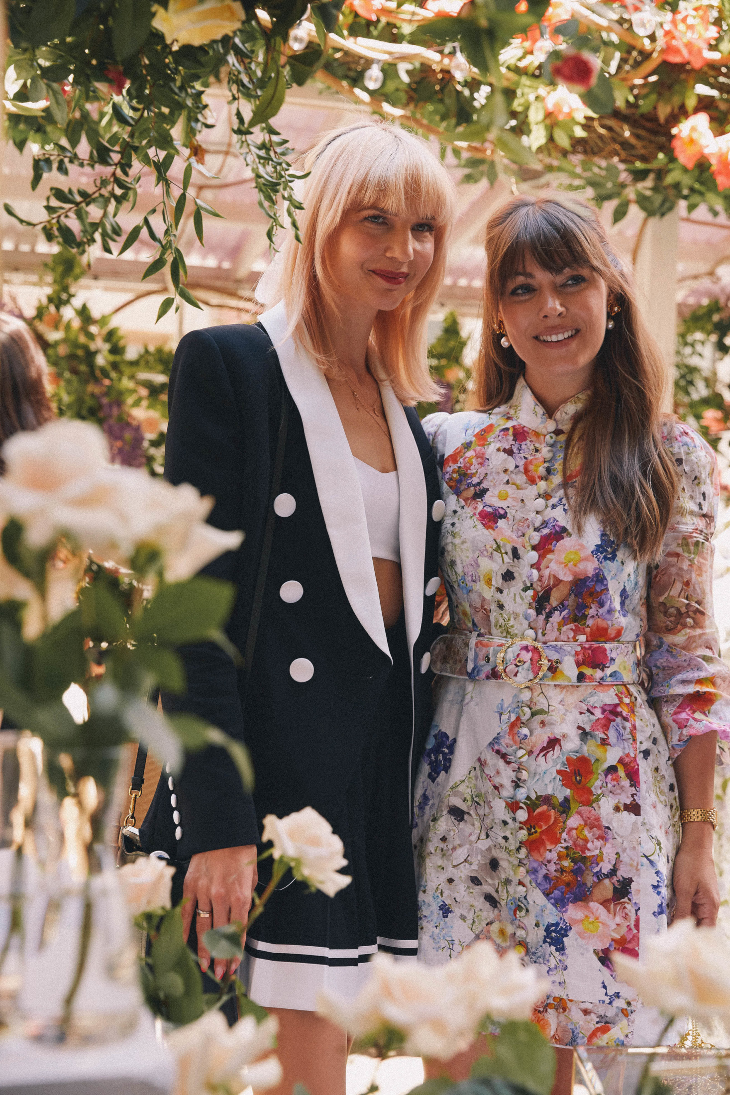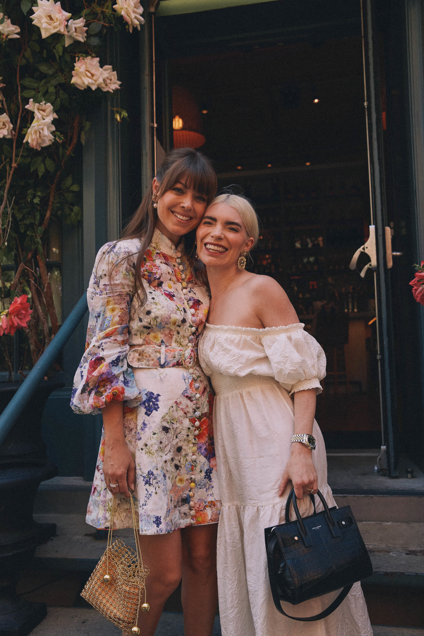 We celebrated on launch day with a lunch at Fig & Olive in the Meatpacking district. The accessories and jewelry were displayed next to this elaborate rosé cart – it was a serious pinch me moment to see my logo next to Jennifer’s blown up on the cart! The flower installation was a beautiful tribute to the design inspiration of florals and gardens. A few of my favorite ladies showed up to support wearing pieces from the collection, that was the moment it felt so real! To see my friends wearing the pieces that I designed meant the world to me.
