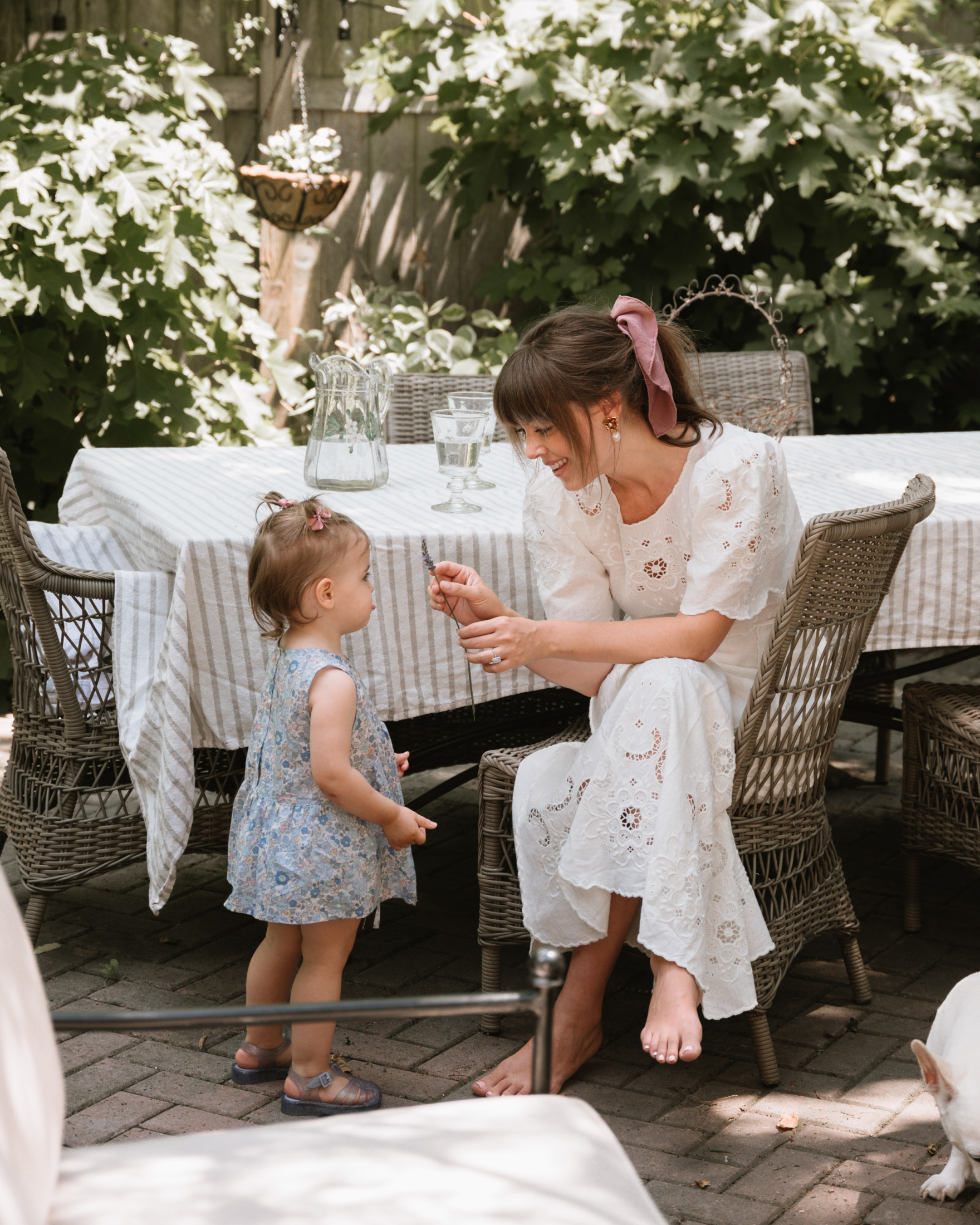 All of this unprecedented weather has us spending the majority of our time either across the street at the park or in the backyard. Lucy’s at that perfect age where she can keep herself preoccupied for hours on end going from activity to activity – so we have a handful of things set up for her especially for this! Our latest addition to the backyard was this little Step 2 play house. She loved the one at her cousins so much I knew it was time. Thankfully this one has muted tones so it’s not eye sore in the backyard that I spent so much time curating. That’s the problem with children toys, they’re just not the most aesthetically pleasing.